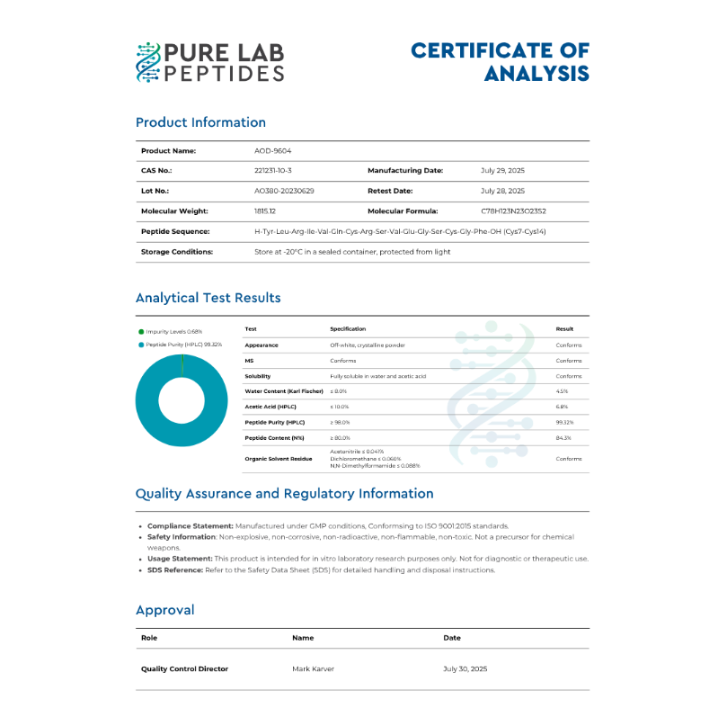 AOD-9604 is a research-grade peptide used extensively in obesity research and muscle regeneration studies. Sourced from high-quality raw materials and synthesized using state-of-the-art technology, our AOD-9604 is guaranteed for its purity and efficacy in research applications.