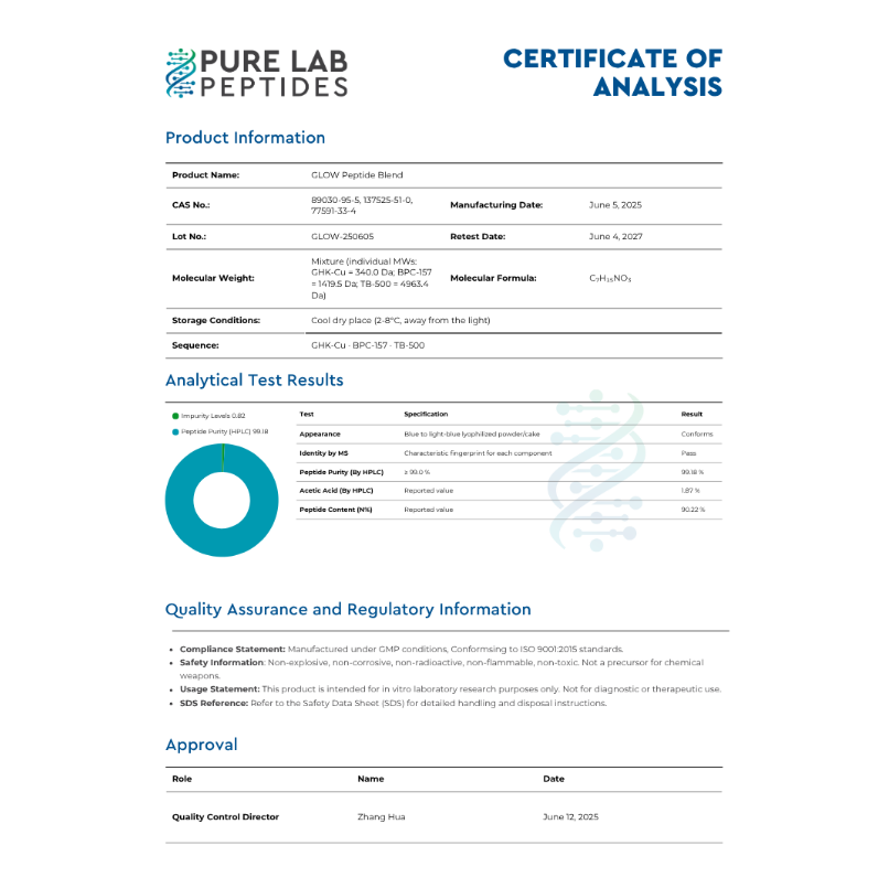 GLOW 70mg Blend combines three powerful peptides—GHK-CuTB-500, and BPC-157—into one synergistic formula designed for advanced regenerative and recovery research. This meticulously formulated blend brings together the cellular rejuvenating properties of GHK-Cu with the repair and anti-inflammatory benefits of TB-500 and BPC-157, creating a unique tool for studying full-spectrum recovery processes.
