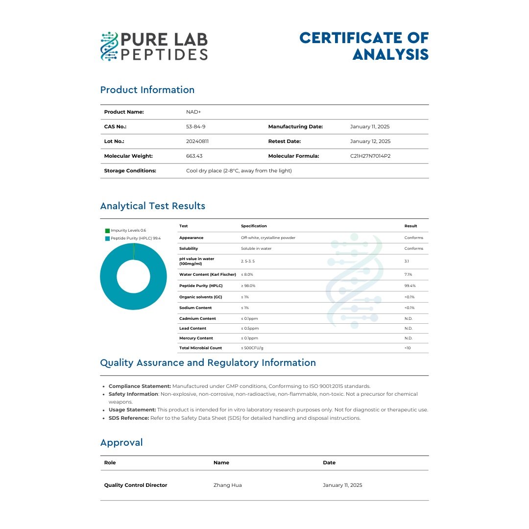 NAD+ 1000mg (Nicotinamide Adenine Dinucleotide) is a critical coenzyme studied extensively for its role in cellular energy metabolism, DNA repair, and aging-related biological pathways. Known for its importance in redox reactions and as a substrate for sirtuins and PARPs, NAD+ has become an essential molecule in longevity and neurobiology research. Our NAD+ is produced using pharmaceutical-grade materials to ensure high purity and stability for dependable scientific study.