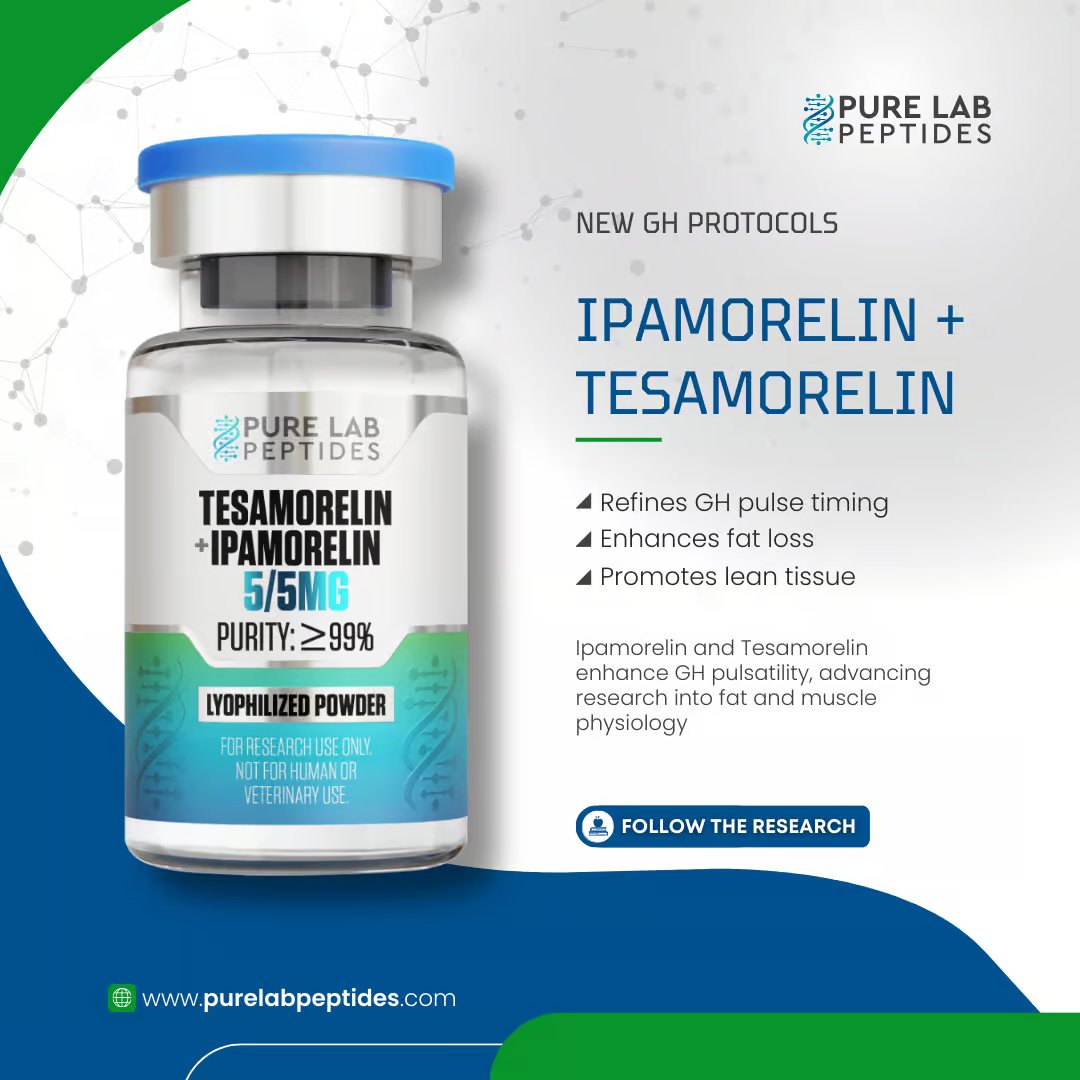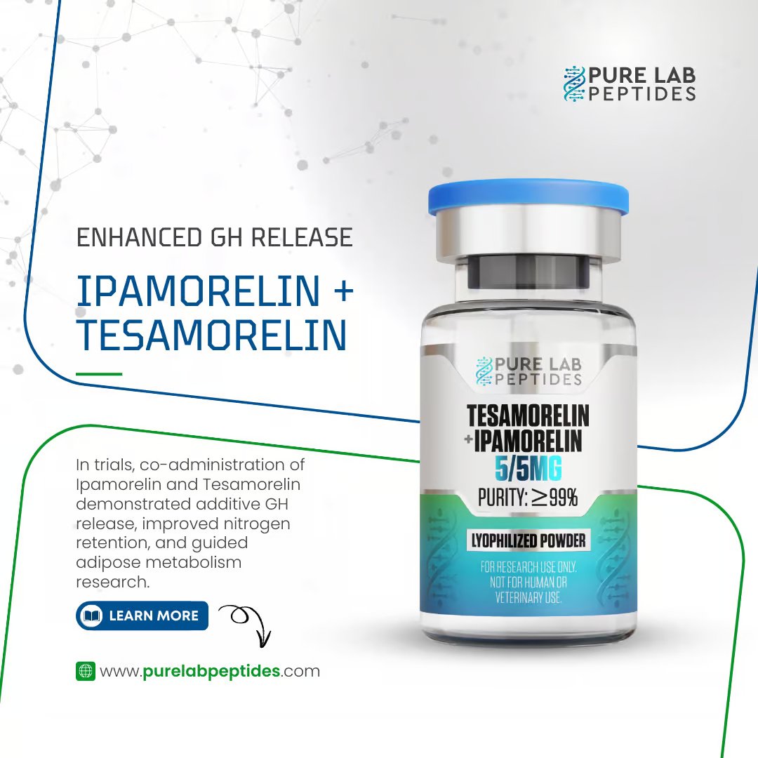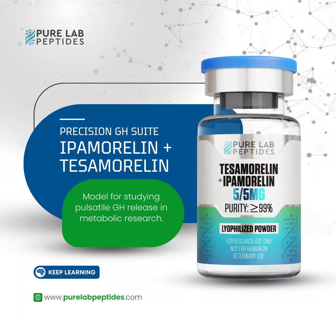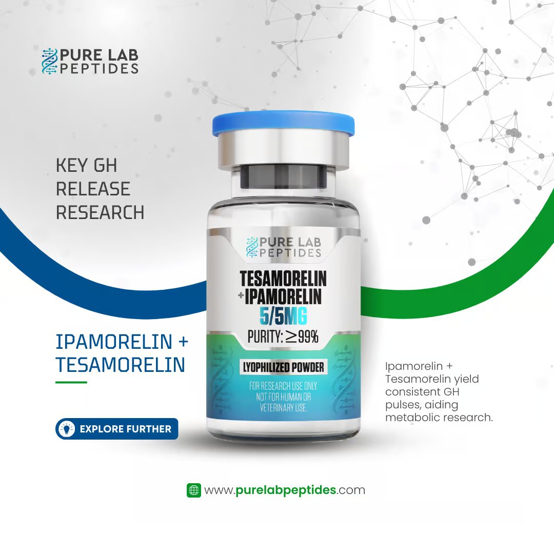 Ipamorelin 5mg + Tesamorelin 5mg (10mg Blend) is a synergistic peptide formulation developed for advanced research into growth hormone (GH) modulation and metabolic enhancement. This blend combines two well-studied peptides, each offering unique and complementary benefits in the areas of anti-aging, fat loss, and regenerative health. Manufactured under strict quality controls, this lyophilized blend is ideal for researchers seeking to explore the combined effects of GHRP (Growth Hormone Releasing Peptide) and GHRH (Growth Hormone Releasing Hormone) analogs.